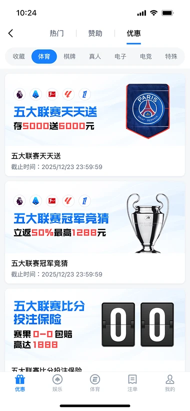活动期间,赛前投注2025-2026五大联赛任意全场比赛比分,如比赛结果为0-0,可获得注单负盈利100%返还,彩金高达1888元!详情请查看官网活动页面。